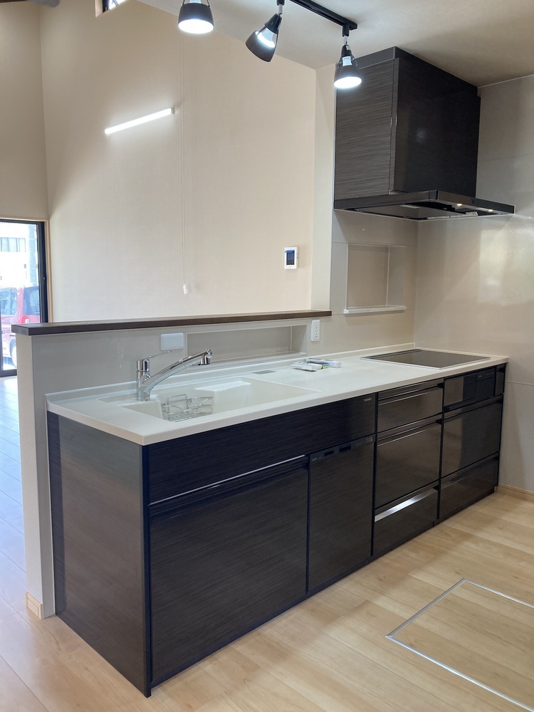 キッチンはダイニングと一体感のある対面型。背面には大型のカップボードと家電収納を備え、作業スペースを広く確保しています。