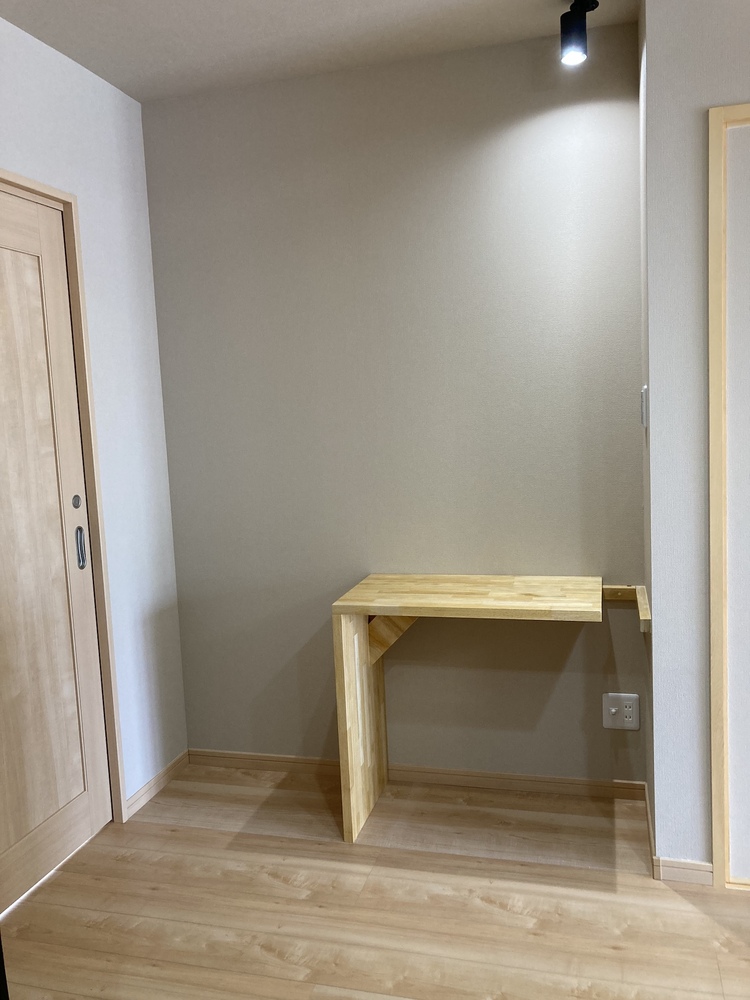 キッチン横には家事カウンターを設置。天板と脚の部分はスライドできる可動式で、カウンター下に配置する収納棚に合わせて、調整が可能です。