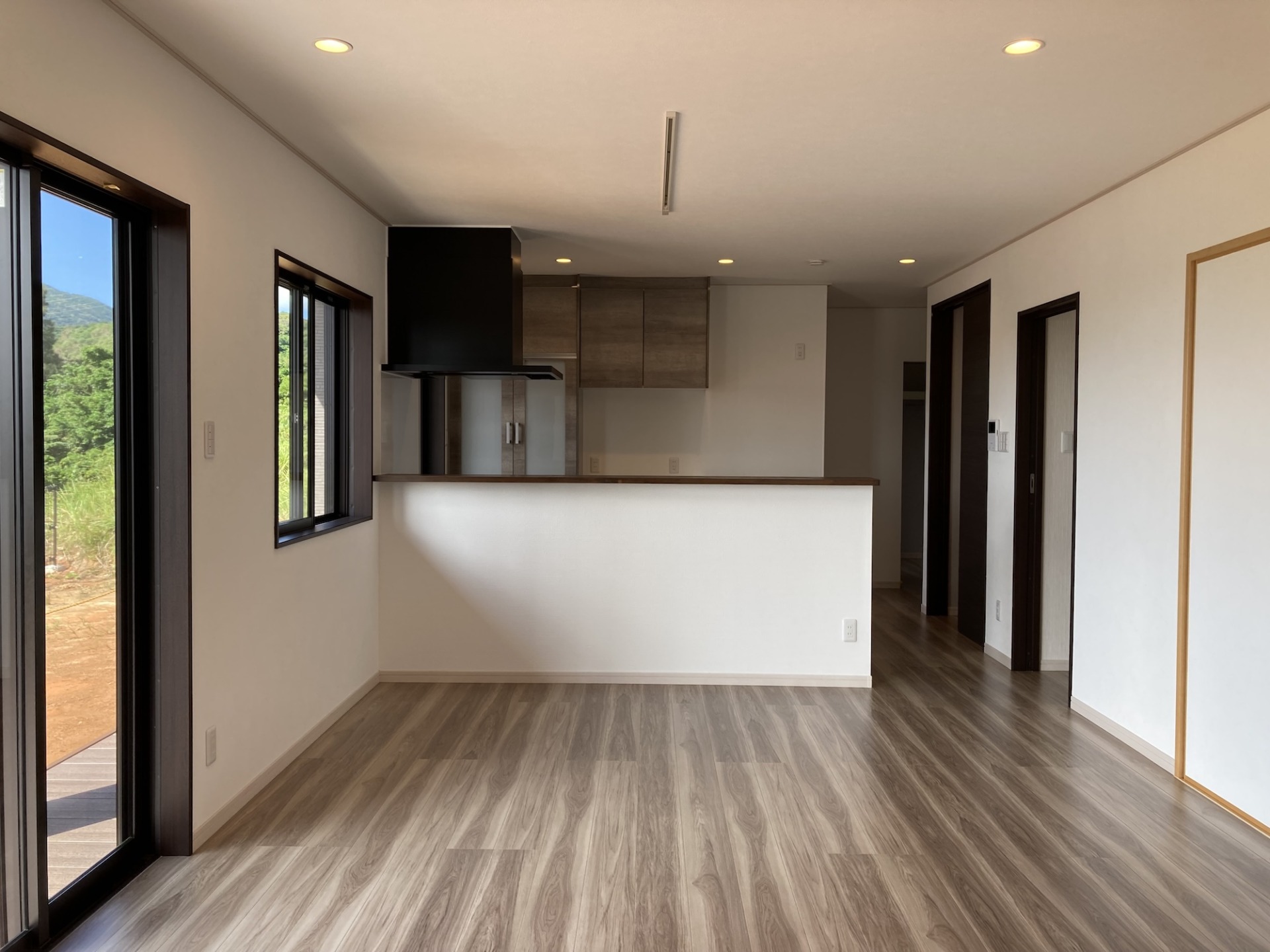 窓の外にはウッドデッキを設け、朝のコーヒーや夕暮れのひとときを外で過ごせるように。屋内と屋外がゆるやかにつながり、自然を近くに感じる住まいになりました。