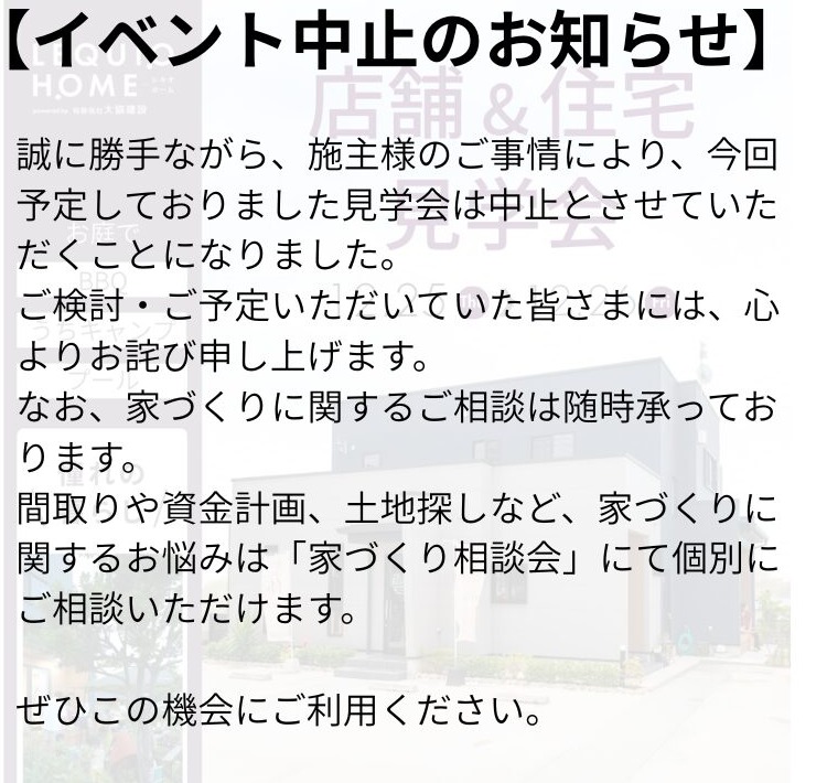 今回のイベントは中止となりましたが、家づくりに関するご相談は、