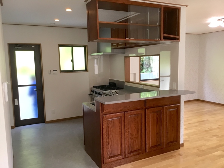 家の中心は、海外出身のS様がこだわって取り寄せたキッチンに合わせて作られたLDK。L字型のキッチンは、作業スペースの前にある壁をくり抜き、リビングが見渡せるだけでなく、リビングとキッチンそれぞれで過ごしながらも家族の一体感を感じる造りです。