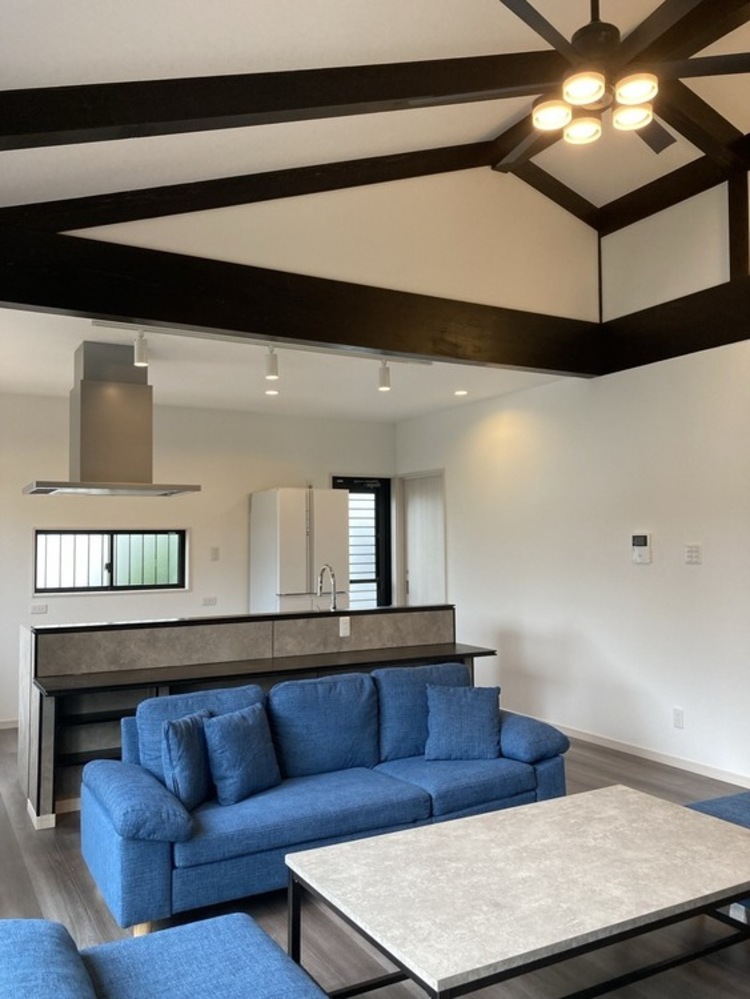 大胆な化粧梁が印象的な勾配天井のLDK
