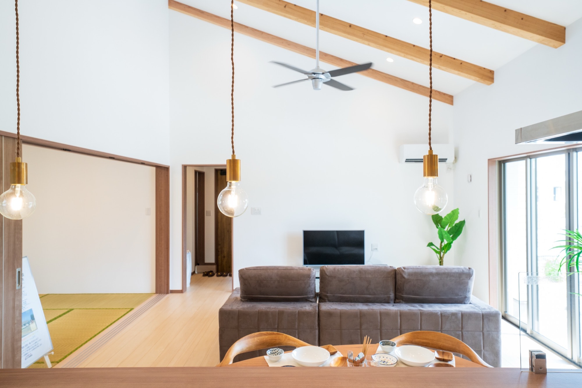 和室とひと続きになるLDKは、20帖もの広さを確保。天井の登り梁を見せる設計により、視線が上へ抜け、実面積以上の開放感を創出しました。西側には大きな掃き出し窓、東側には高窓を配し、朝から夕方まで優しい光が差し込む空間となっています。