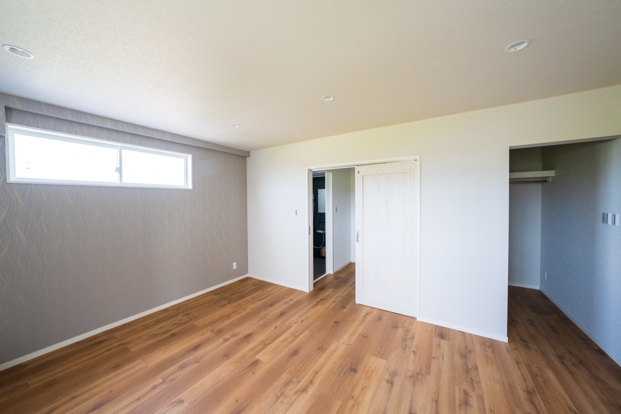 寝室には、落ち着いた色調のアクセントウォールを採用し、リラックスできる空間を演出しました。壁の上部には高窓を設け、プライバシーを保ちつつ、自然光を優しく採り入れる設計です。